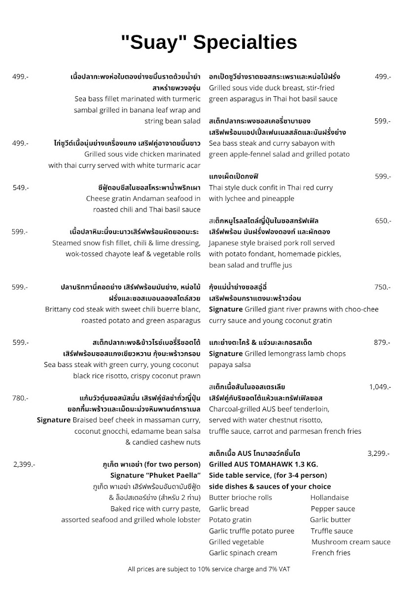 Suay Cherngtalay specializes in delivering exceptional quality food, evident in their meticulously crafted dishes. The highlights include savory house smoked duck and the exquisite sea bass steak with green curry espuma, praised for its unique flavor profiles. Guests rave about the attention to detail in every plate, making it a perfect spot for family gatherings or a romantic dinner.